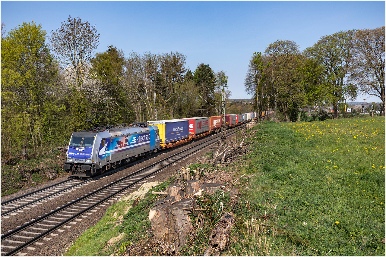 Beginnen wir also die Tour durch die Region dort, wo sie im Dezember 2019 endete: am Gemmenicher Weg. Railpool 186 495 ist für DB Cargo Nederland im Einsatz und zieht am 5. April 2020 den BASF-Zug 47560 Ludwigshafen – Antwerpen Nord in Richtung Grenze. An diesem Sonntag war der Spazierweg entlang der Bahn sehr beliebt und belebt. Ich habe mich deshalb entschlossen, die vielen bunten Wanderer im Bild durch eine dezentere Gruppe von Radfahrern aus einer anderen Aufnahme zu ersetzen.