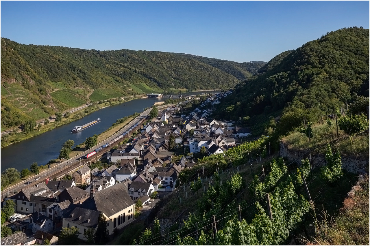 Nachdem ich an den perfekten Fotowetter-Tagen Ende Juni leider Krankenwache bei meinem Kater hatte und die Sonnentage danach rar wurden, war ich froh, am 21. Juli 2020 das Homeoffice mittags schließen und an die Mosel fahren zu können. Oberhalb von Lehmen gibt es im Klosterberg eine Fotostelle mit schöner Aussicht. Richtung Norden geht der Blick nach Kobern-Gondorf und am anderen Moselufer nach Niederfell. Ein Erzzug mit zwei Loks der Baureihe 189 durchfährt auf der Route Rotterdam – Dillingen die Oberburg in Gondorf, das weiße Gebäude ganz hinten im Bild. Die Burg der Fürsten von der Leyen wird von Bahn und Straße zerteilt, sodass dieser Teil jetzt mehr wie ein Stadttor wirkt.