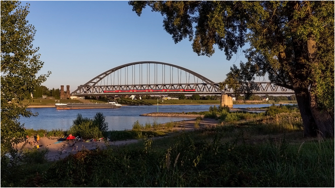 Ende Juli zeigt der Sommer, was er kann – und ich mache Brückentage. Nein, kein Urlaub vom Homeoffice, sondern nach dem Moresneter Viadukt ist heute die Hammer Rheinbrücke zwischen Neuss und Düsseldorf als Fotostandort an der Reihe. Der im Dezember 2020 anstehende Betreiberwechsel auf der Linie RE 4 lockt derzeit viele Eisenbahnfreunde in die Neusser Rheinwiesen. Ganz andere Gründe sind wohl für die Familie unten links im Bild ausschlaggebend, hier ihren Sonnenschirm aufzustellen. Im Bild ist RE 10432 auf dem Weg von Dortmund nach Aachen zu sehen. Um noch etwas Sonne im Vordergrund und ein Schiff im Bild zu haben, stammen die meisten Teile dieses Fotos aus einer Aufnahme etwa 25 Minuten vor Durchfahrt des RE. Auf diese Weise konnte auch die optische „Kollision“ mit einer S-Bahn auf der Brücke vermieden werden.