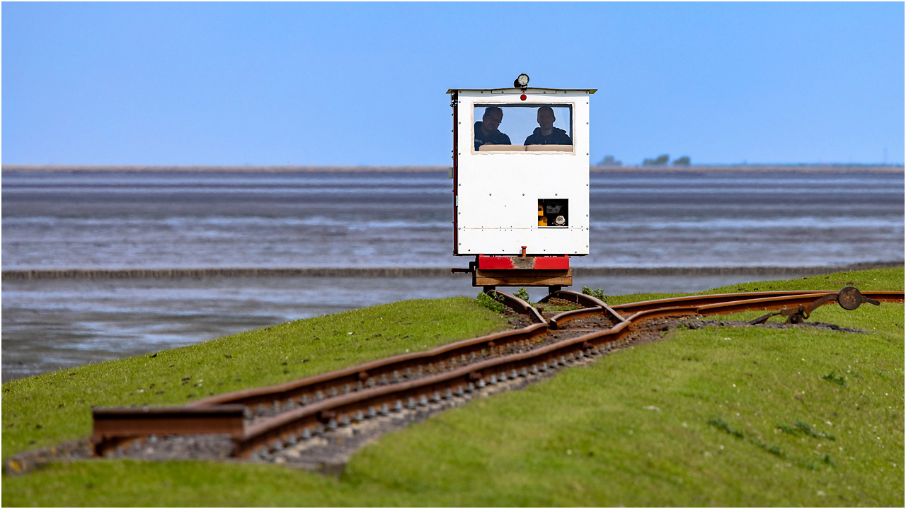 Ziel des Ausflugs an diesem Tag war der Lüttmoordamm in Reußenköge. Er verbindet den Beltringharder Koog mit der Hallig Nordstrandischmoor. Kurz bevor die Sonne hinter Wolken verschwand, fuhr die elektrische Kabinenlore der Familie Siefert heimwärts zur Hallig.